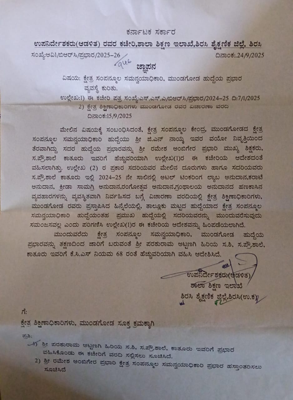 Education Department: ಮುಂಡಗೋಡ: ಕಾತೂರಿನ ಪ್ರೌಢ ಶಾಲೆಯಲ್ಲಿ ಕ್ರೀಡಾ ಸಾಮಗ್ರಿ ಸೇರಿದಂತೆ ವಿವಿಧ ಅನುದಾನವನ್ನು ಸಮರ್ಪಕವಾಗಿ ನಿರ್ವಹಿಸದ ಕ್ಷೇತ್ರ ಸಂಪನ್ಮೂಲ ಕೇಂದ್ರದ ಸಮನ್ವಯ ಪ್ರಬಾರ ಹುದ್ದೆಯಲ್ಲಿದ್ದ  ಸನ್ಮಾನ್ಯ ಶ್ರೀ ರಮೇಶ್ ಅಂಬಿಗೇರ ಅವರನ್ನು ಆ ಸ್ಥಾನದಿಂದ ತೆರವುಗೊಳಿಸಿ ಕಾತೂರಿನ ಸಹ ಶಿಕ್ಷಕ ಪರಶುರಾಮ ಅಟ್ಟಣಗಿ ಅವರನ್ನು ಆ ಹುದ್ದೆಗೆ ನೇಮಿಸಿ ಶಿರಸಿ ಸಾರ್ವಜನಿಕ ಶಿಕ್ಷಣ ಇಲಾಖೆಯ ಉಪನಿರ್ದೇಶಕರು ಆದೇಶ ಹೊರಡಿಸಿದ್ದಾರೆ.