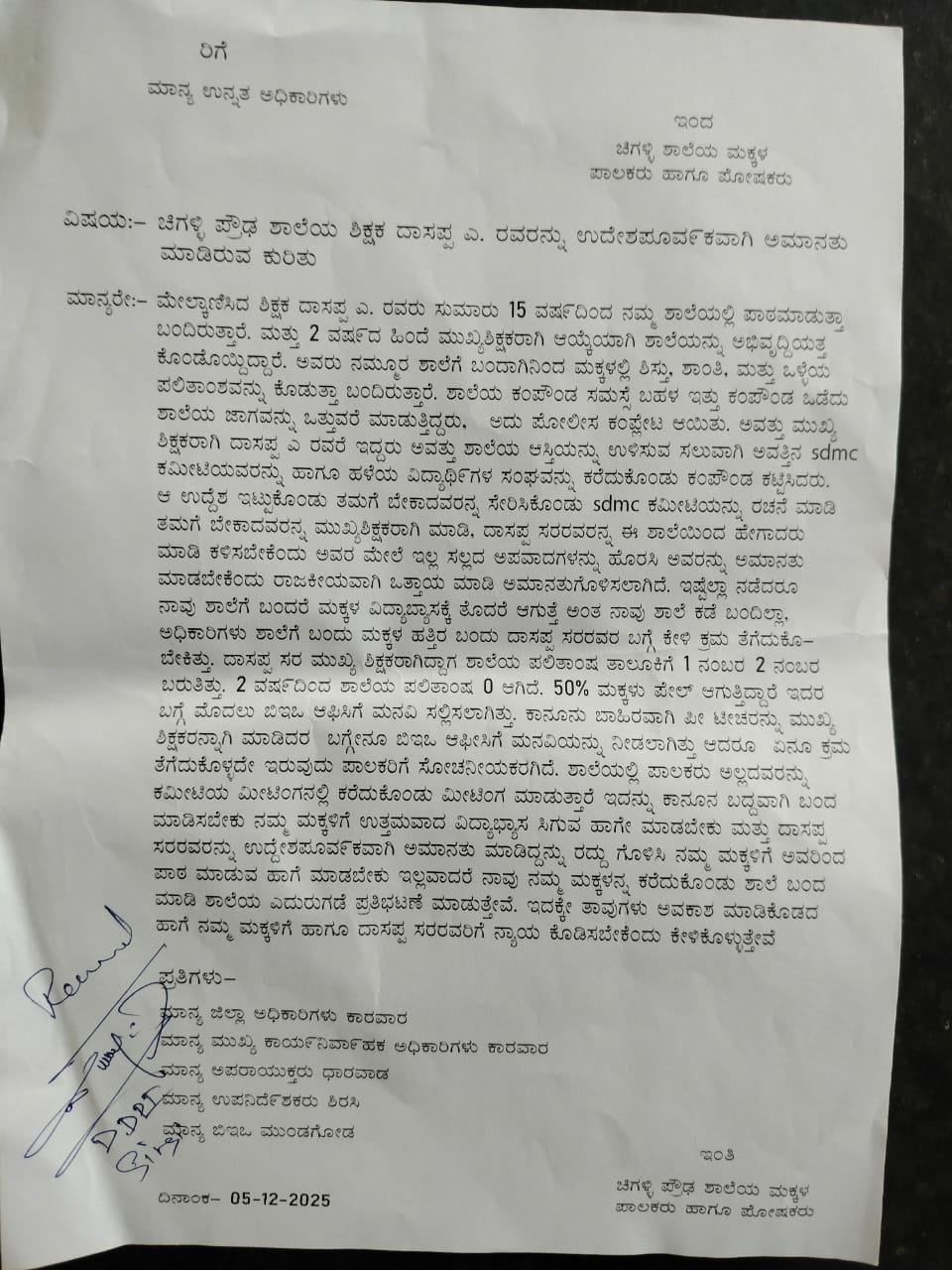 ಶಿರಸಿ ಡಿಡಿಪಿಐ ತವರಿಗೆ ಚಿಗಳ್ಳಿ ಪ್ರೌಢಶಾಲೆಯ ಕೆಲ ಪಾಲಕರು ಮನವಿ ಅರ್ಪಿಸಿದ್ದು, ಮನವಿಯಲ್ಲಿ ಅಮಾನತ್ತುಗೊಂಡ ಶಿಕ್ಷಕ ದಾಸಪ್ಪ ಎ. ಪರವಾಗಿ ಹೇಳಿಕೊಂಡಿದ್ದಾರೆ. ದಾಸಪ್ಪರವರು ಸುಮಾರು 15 ವರ್ಷದಿಂದ ನಮ್ಮ ಶಾಲೆಯಲ್ಲಿ ಪಾಠಮಾಡುತ್ತಾ ಬಂದಿರುತ್ತಾರೆ. ಮತ್ತು 2 ವರ್ಷದ ಹಿಂದೆ ಮುಖ್ಯಶಿಕ್ಷಕರಾಗಿ ಆಯ್ಕೆಯಾಗಿ ಶಾಲೆಯನ್ನು ಅಭಿವೃದ್ಧಿಯತ್ತ ಕೊಂಡೊಯ್ದಿದ್ದಾರೆ.