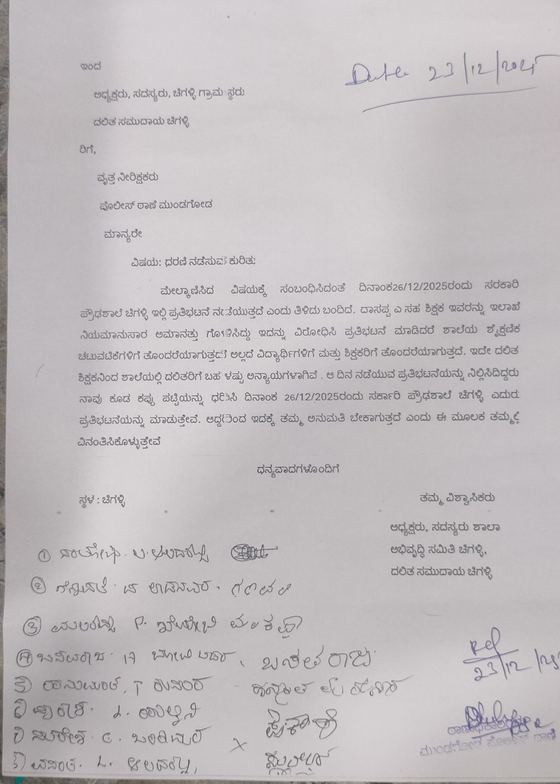 ಒಂದು ವೇಳೆ ದಲಿತ ಮುಖಂಡ ಚಿದಾನಂದ ಹರಿಜನ್ ರವರು ಡಿಸೆಂಬರ್ 26 ರಂದು ಧರಣಿ ಸತ್ಯಾಗ್ರಹ ಮಾಡಿದರೆ, ನಾವೂ ಕೂಡ ಅದೇ ಸ್ಥಳದಲ್ಲಿ ಪ್ರತಿಭಟನೆ, ಧರಣಿ ಸತ್ಯಾಗ್ರಹ ಹಮ್ಮಿಕೊಳ್ಳುತ್ತೇವೆ. ಮುಂದೇ ಅದೇನೇ ಸಮಸ್ಯೆ ಆದ್ರೂ ಅವ್ರೇ ಜವಾಬ್ದಾರರು ಅಂತಾ ಮನವಿಯಲ್ಲಿ ತಿಳಿಸಿದ್ದಾರೆ.